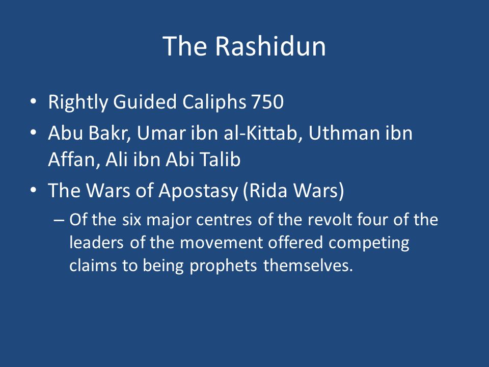 After the death of The Prophet, Abu Bakr was elected the head of the Muslims and during his time there appeared imposters who claimed prophethood like Musaylimah. Abu Bakr formed an army which he wanted to lead himself, were it not for the insistence of the leaders of the community that he stayed at the capital, Madina.