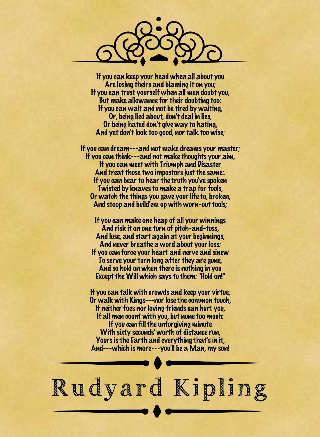 | IF you can keep your head when all about you Are losing theirs and blaming it on you, If you can trust yourself when all men doubt you, But make allowance for their doubting too; If you can wait and not be tired by waiting, Or being lied about, don’t deal in lies, Or being hated, don’t give way to hating, And yet don’t look too good, nor talk too wise: If you can dream – and not make dreams your master; If you can think – and not make thoughts your aim; If you can meet with Triumph and Disaster And treat those two impostors just the same; If you can bear to hear the truth you’ve spoken Twisted by knaves to make a trap for fools, Or watch the things you gave your life to, broken, And stoop and build ’em up with worn-out tools: If you can make one heap of all your winnings And risk it on one turn of pitch-and-toss, And lose, and start again at your beginnings And never breathe a word about your loss; If you can force your heart and nerve and sinew To serve your turn long after they are gone, And so hold on when there is nothing in you Except the Will which says to them: ‘Hold on!’ If you can talk with crowds and keep your virtue, ‘ Or walk with Kings – nor lose the common touch, if neither foes nor loving friends can hurt you, If all men count with you, but none too much; If you can fill the unforgiving minute With sixty seconds’ worth of distance run, Yours is the Earth and everything that’s in it, And – which is more – you’ll be a Man, my son! |