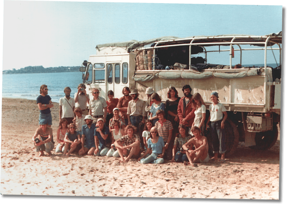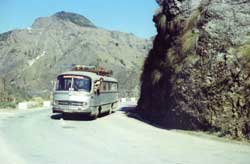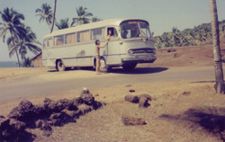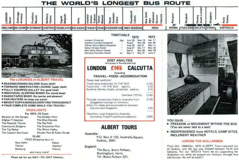 Until 1970 the bus was shipped from Calcutta to Sydney, thereafter the bus ran to Calcutta from which passengers could chose to fly across Burma to Bangkok, Thailand and continue by train through Malaysia to Singapore where a boat would carry them to Perth or Sydney, Australia. The bus stopped en route to allow passengers to visit sites of interest and local shops. In the early years a one-way ticket was £85, this rose to £125 by the early 1970s excluding catering. The connection via Singapore to Australia was a further £125. The trip was advertised as “the world’s longest bus route” and “your complete home while you travel”.