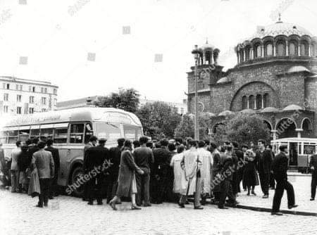 Mandatory Credit: Photo by Geoff Blythe/ANL/Shutterstock (1460231a) London To Calcutta Bus Trip 1957 (london To India By Bus) The Coach Full Of 20 British Stop For A Picnic By The River In Yugoslavia During Their Trip London To Calcutta Bus Trip 1957 (london To India By Bus) The Coach Full Of 20 British Stop For A Picnic By The River In Yugoslavia During Their Trip