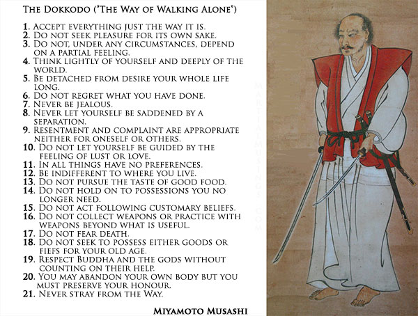 The Dokkodo or “The Way of Walking Alone” written by Miyamoto Musashi just before dying, for the occasion where Musashi was giving away everything he owned in preparation for his death.