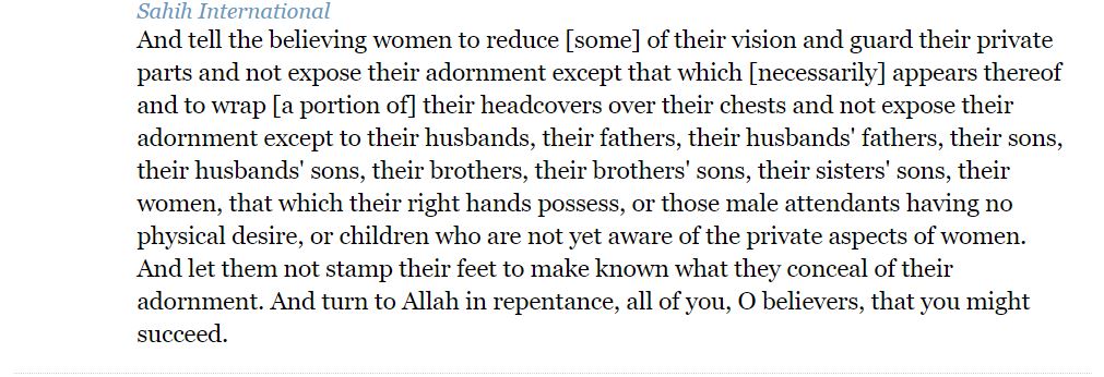 “Tell the believing men to lower their gaze and to be mindful of their chastity: this will be most conducive to their purity – [and,] verily, God is aware of all that they do. And tell the believing women to lower their gaze and to be mindful of their chastity, and not to display their charms [in public] beyond what may [decently] be apparent thereof; hence, let them draw their head-coverings over their bosoms. And let them not display [more of] their charms to any but their husbands, or their fathers, or their husbands’ fathers, or their sons, or their husbands’ Sons, or their brothers, or their brothers’ sons, or their sisters’ sons, or their womenfolk, or those whom they rightfully possess, or such male attendants as are beyond all sexual desire, or children that are as yet unaware of women’s nakedness; and let them not swing their legs [in walking] so as to draw attention to their hidden charms And [always], O you believers – all of you – turn unto God in repentance, so that you might attain to a happy state!” (The Quran 24:30-31)