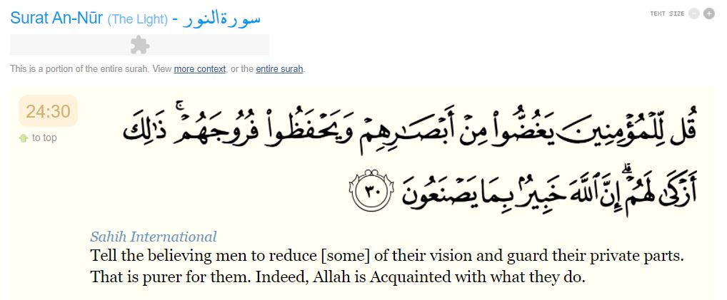 “Tell the believing men to lower their gaze and to be mindful of their chastity: this will be most conducive to their purity – [and,] verily, God is aware of all that they do. And tell the believing women to lower their gaze and to be mindful of their chastity, and not to display their charms [in public] beyond what may [decently] be apparent thereof; hence, let them draw their head-coverings over their bosoms. And let them not display [more of] their charms to any but their husbands, or their fathers, or their husbands’ fathers, or their sons, or their husbands’ Sons, or their brothers, or their brothers’ sons, or their sisters’ sons, or their womenfolk, or those whom they rightfully possess, or such male attendants as are beyond all sexual desire, or children that are as yet unaware of women’s nakedness; and let them not swing their legs [in walking] so as to draw attention to their hidden charms And [always], O you believers – all of you – turn unto God in repentance, so that you might attain to a happy state!” (The Quran 24:30-31)