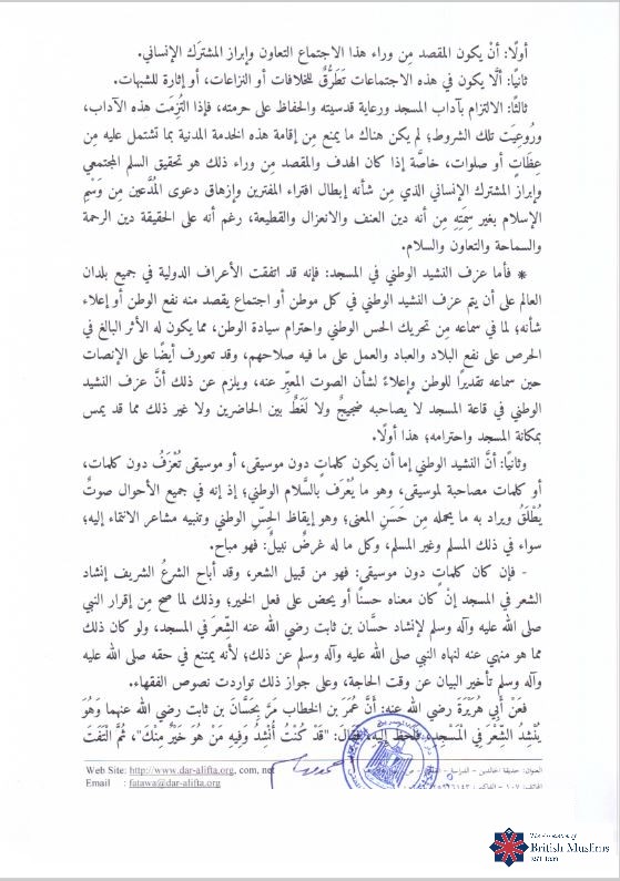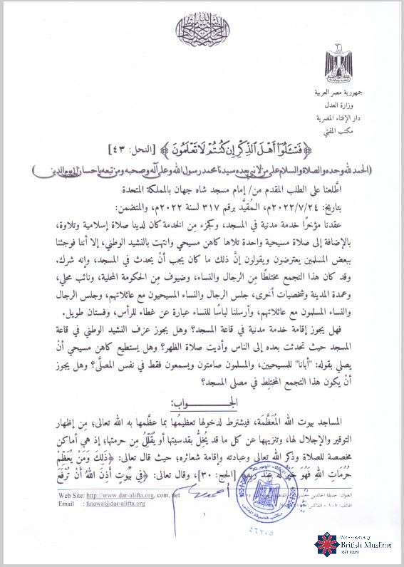 ENGLISH TRANSLATION OF FATWA ON PERMISSIBILITY OF SINGING GOD SAVE THE QUEEN IN MASJIDS WITHIN THE UNITED KINGDOM AND COMMONWEALTH NATIONS WHERE HER MAJESTY THE QUEEN IS HEAD OF STATE.